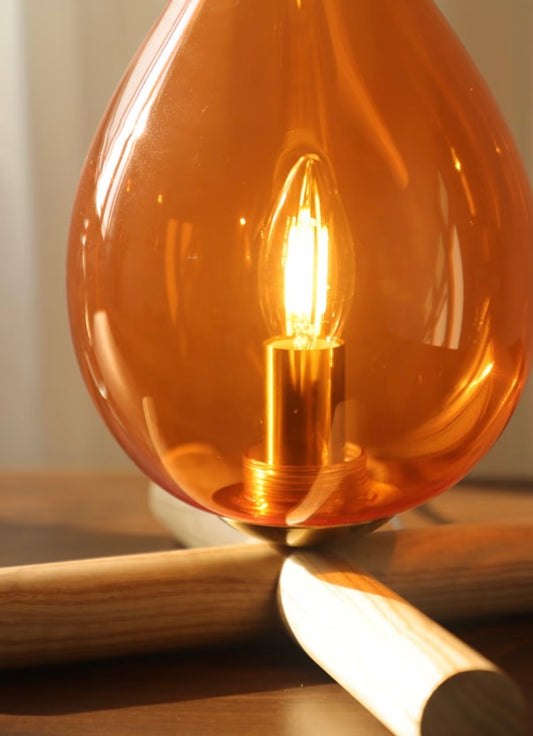 Amber Flame Blown Glass Table Lamp with Solid Wood Base – LED 3-Color Light