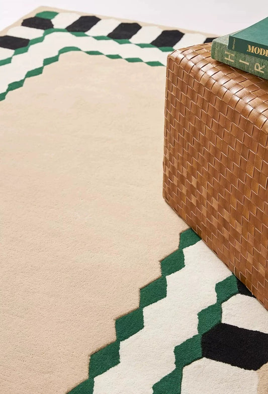 Deco Frame Handwoven Rug – Sand Beige & Emerald Green