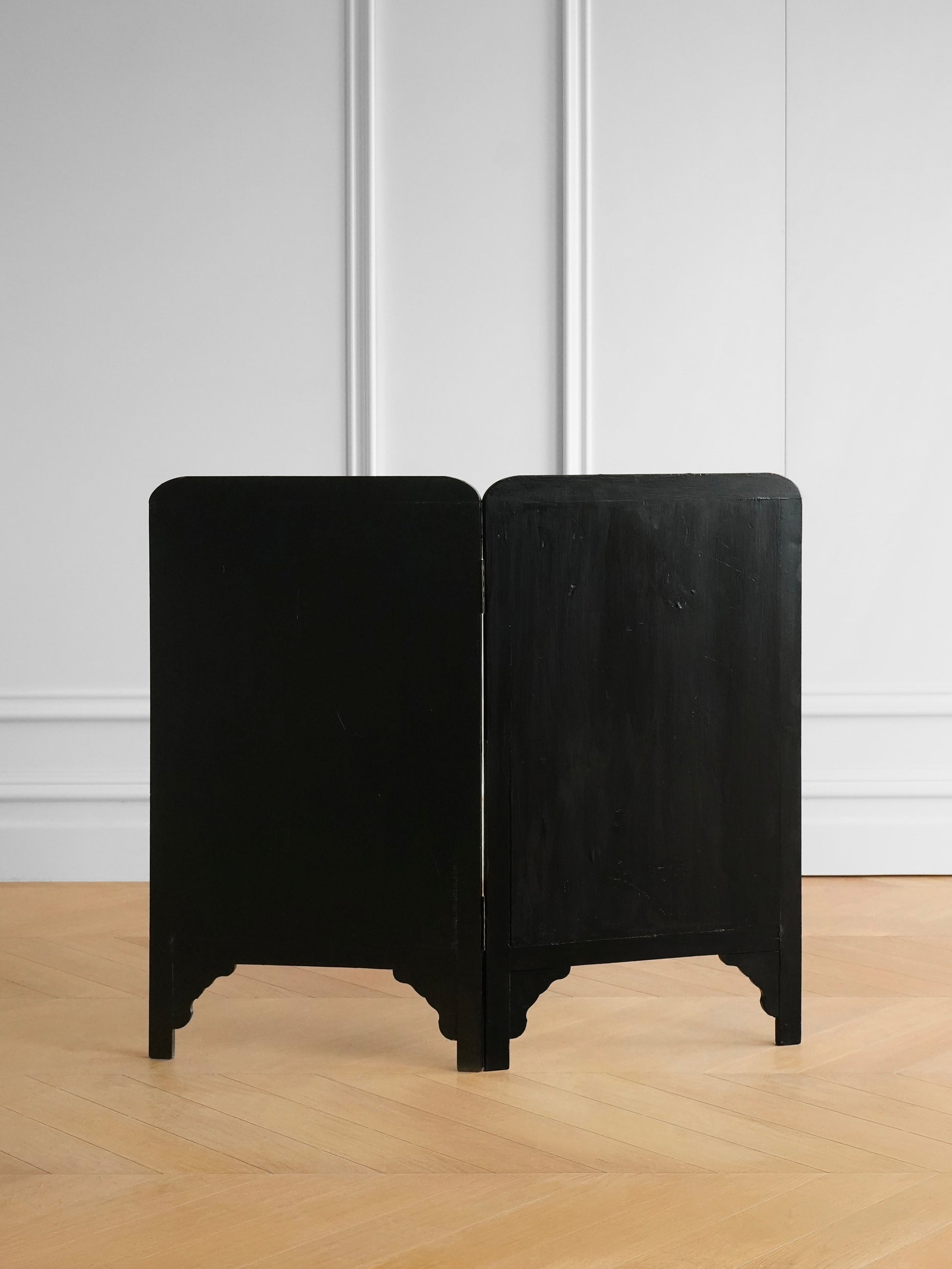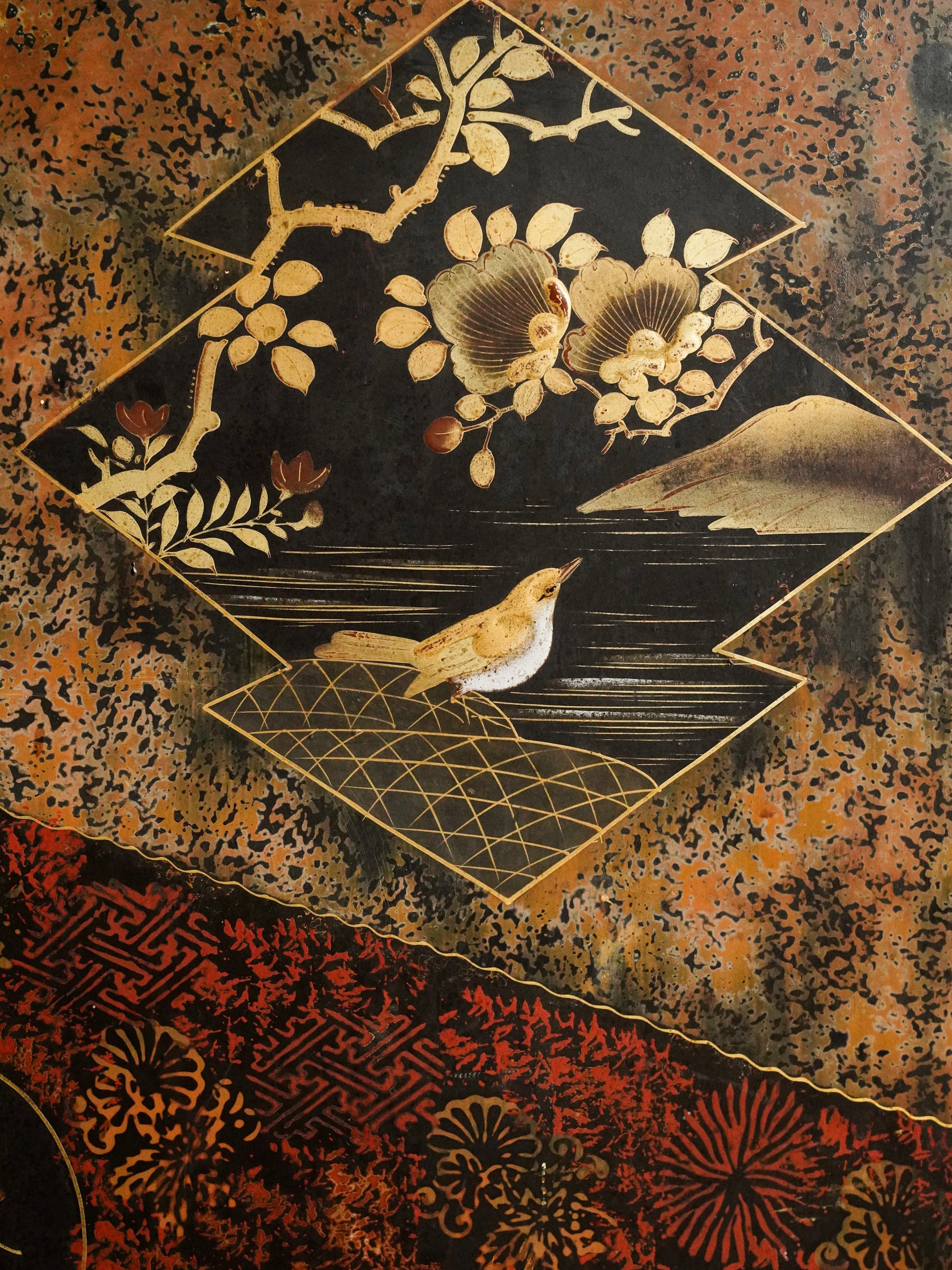 The surface reveals layers of texture and age, with subtle craquelure, tonal variation, and patina that attest to its hand-applied lacquer process. Gold detailing is finely articulated, standing in elegant contrast to the darkened background, while the asymmetrical placement of motifs across the panels creates a sense of rhythm and movement. The gently rounded panel corners and shaped feet further enhance the object’s sculptural presence.