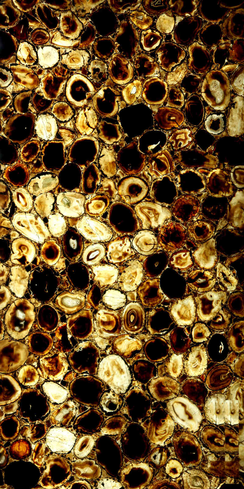 Dramatic and intensely luminous, the Midnight Agate Translucent Gemstone Slab is composed of hand-selected agate slices layered in tones of deep espresso, amber gold, honey translucence, and rich onyx black. The natural concentric banding of each slice creates a powerful organic mosaic with striking visual depth.
