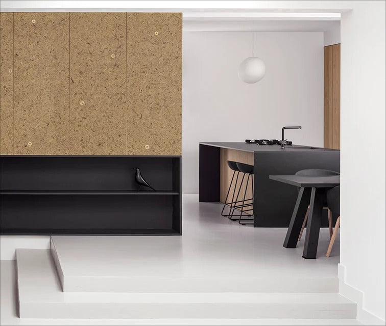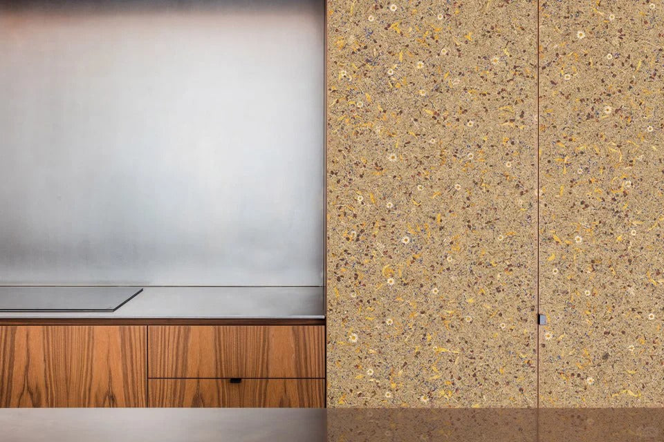 Unlike single-species floral boards, this material does not emphasize botanical identification. Instead, it focuses on material composition and spatial atmosphere, allowing the purple petals to function as abstract natural accents rather than literal floral imagery. Each panel carries inherent variation, reflecting the randomness and authenticity of plant-based materials.