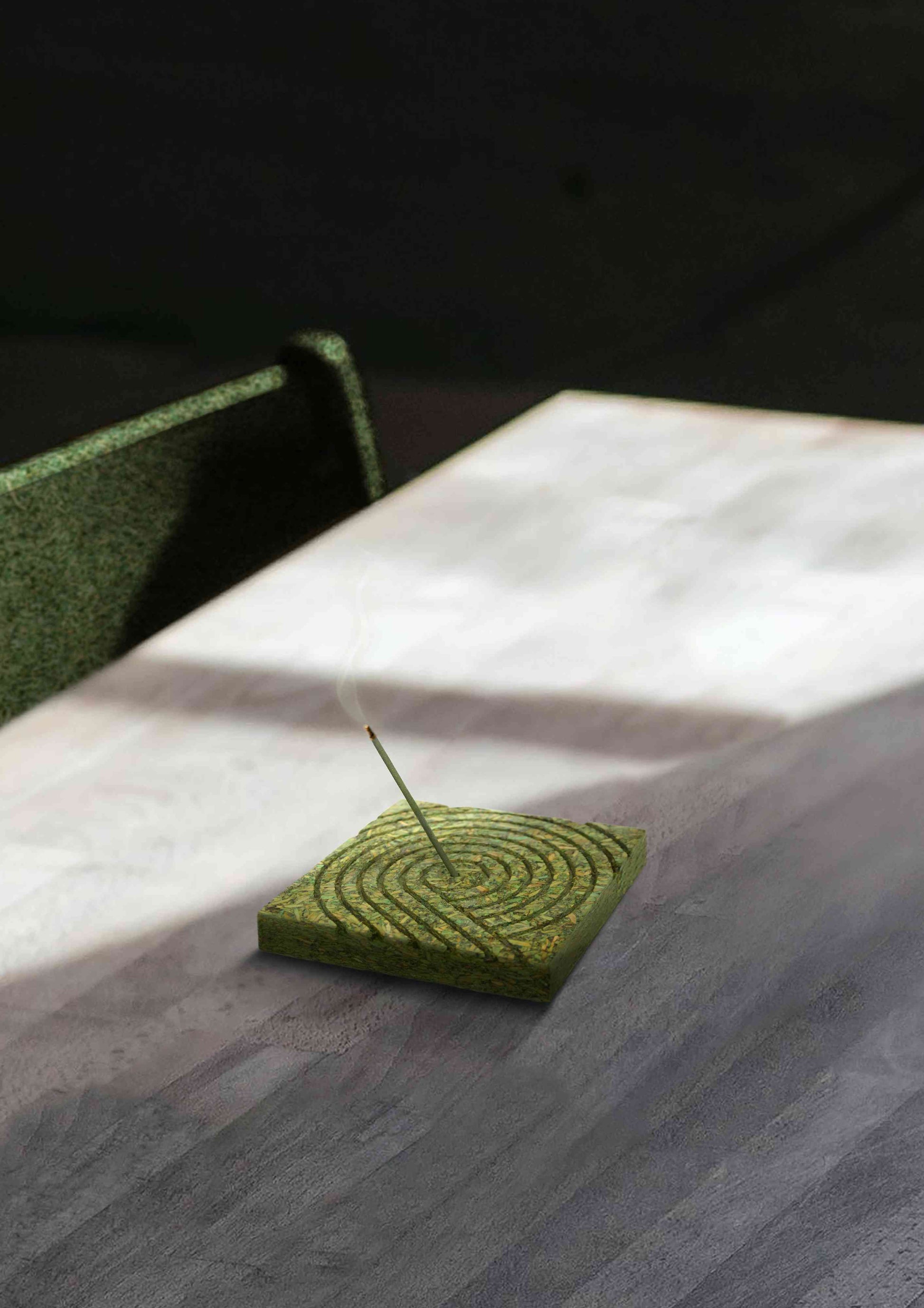 The green coloration introduces a gentle botanical character while preserving the material’s raw texture and tactile depth, reinforcing the connection between natural resources, material reuse, and thoughtful design.