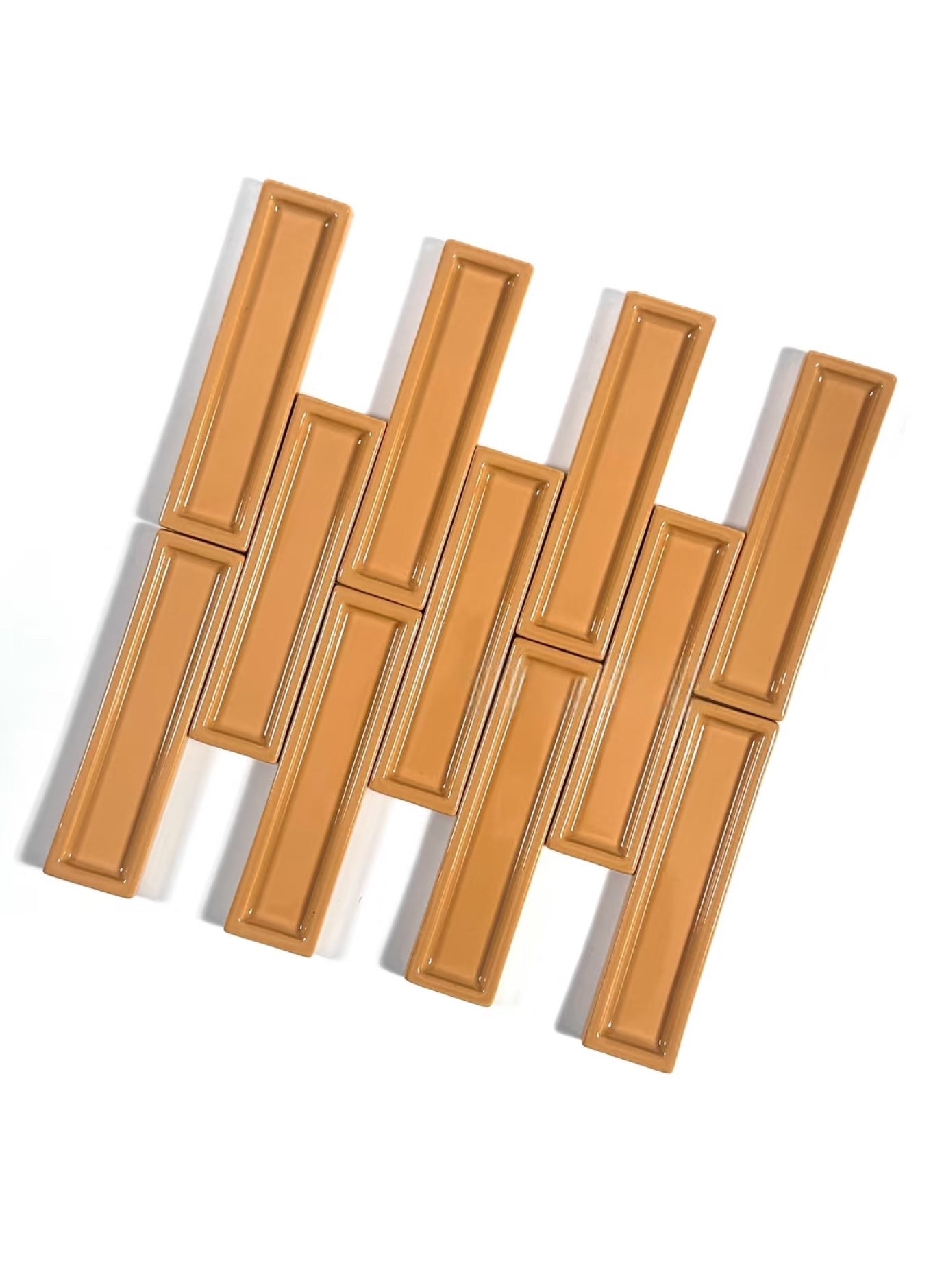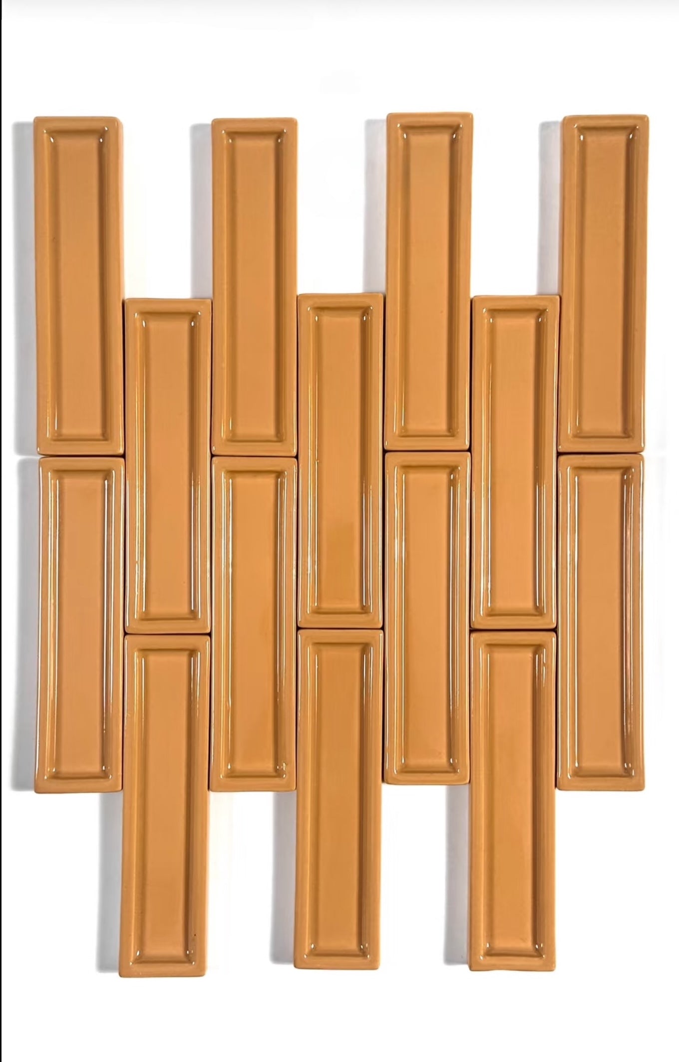 Drenched in our signature Crystalline Amber Glaze, these tiles exhibit a rich, honeyed depth that feels both historic and contemporary. The high-gloss, translucent finish is engineered to break over the sharp linear peaks, revealing a lighter, toasted ochre at the ridges while pooling into a deep, saturated burnt-orange in the valleys. This vitrified, mirror-like surface acts as a light-catcher, transforming throughout the day as the sun moves, offering a tactile experience that is as warm to the eye as it is smooth to the touch.