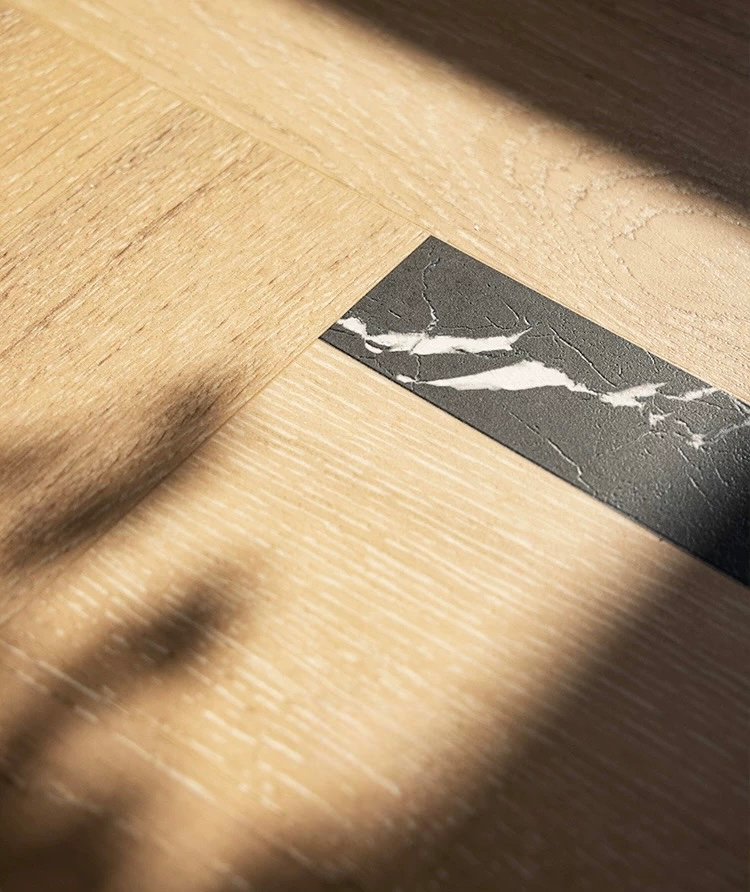 Available in four refined styles—Elm Wood, Rubber Wood, Pear Wood, and Pine Wood—each variation showcases intricate wood grain textures enhanced by elegant marble inlays, creating a striking visual contrast. The large-format design enhances spaciousness while ensuring effortless installation.