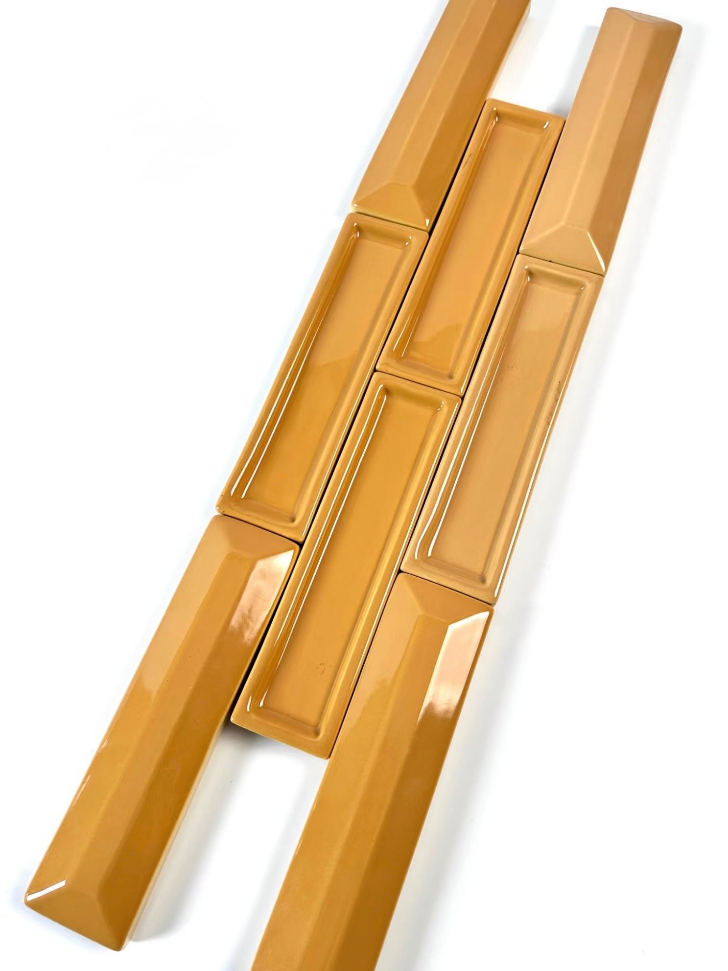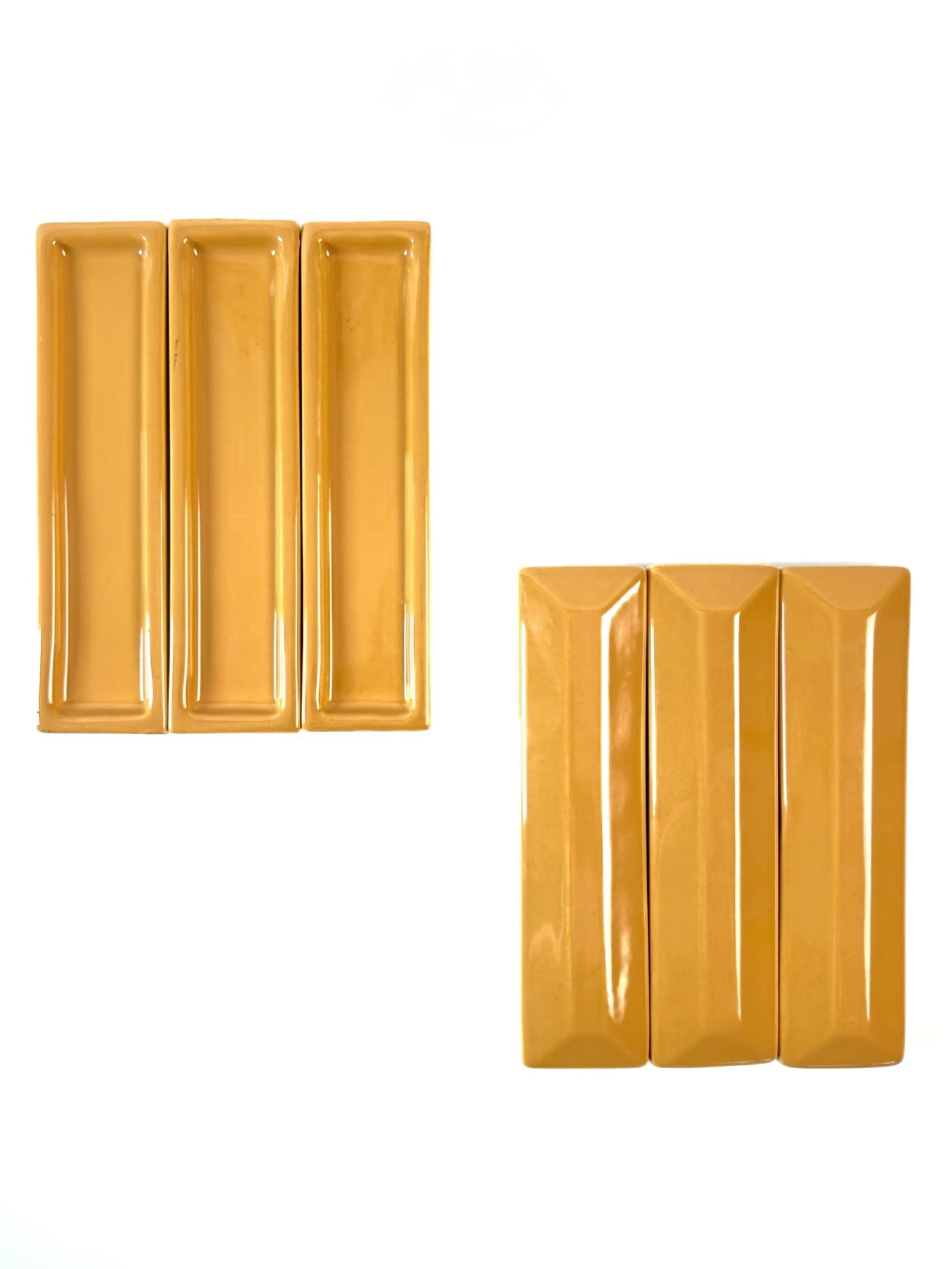 These 3D glossy mustard relief tiles feature an interplay of concave and convex surfaces, creating a geometric rhythm that plays with light and shadow. The bold mustard glaze adds warmth and vibrancy, making them ideal for statement walls, kitchen backsplashes, or feature installations that seek both color and texture.