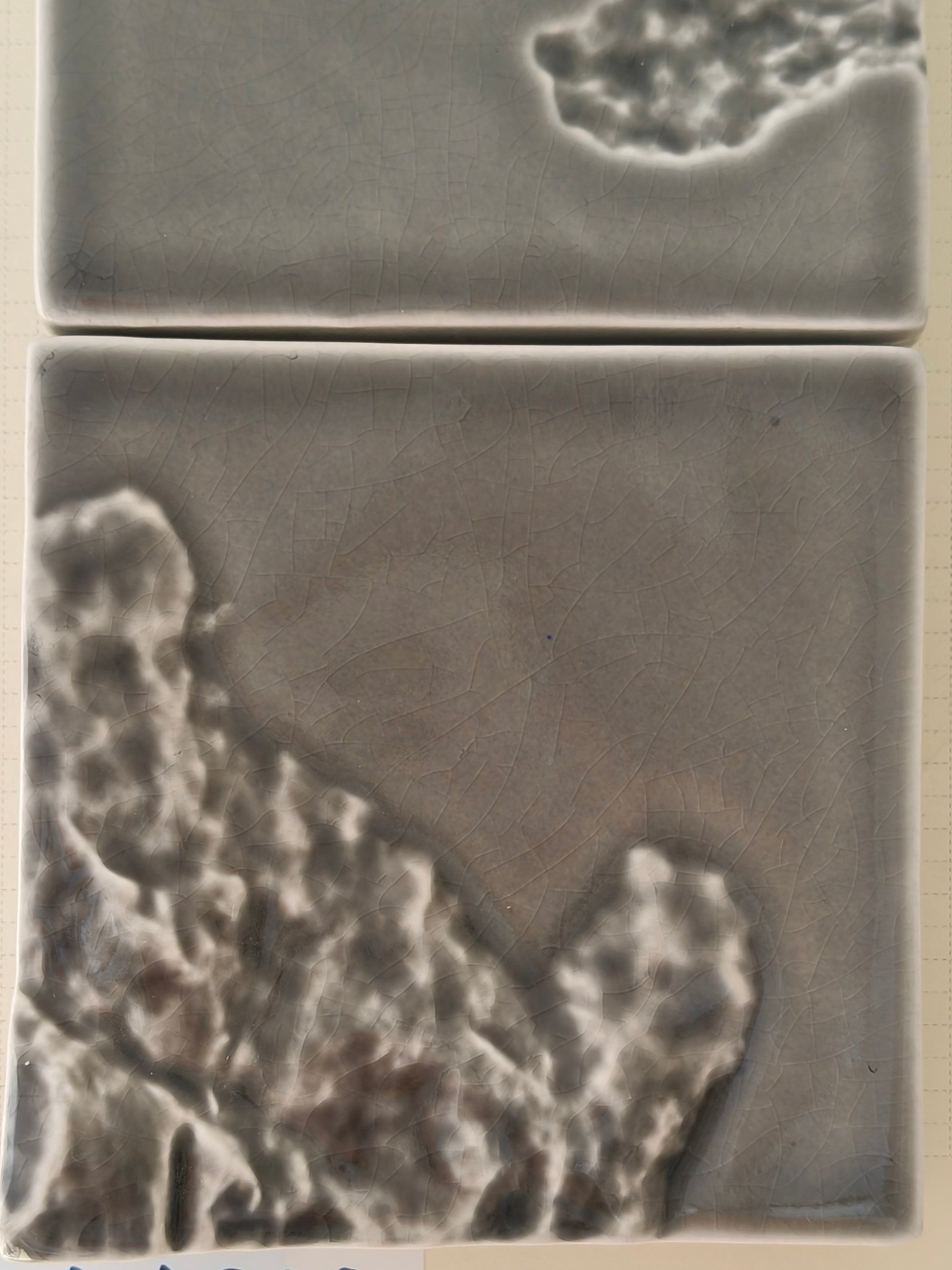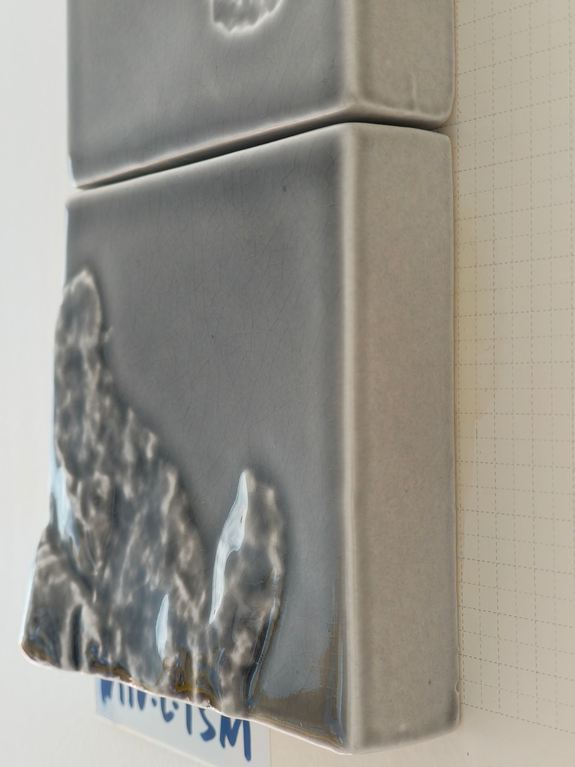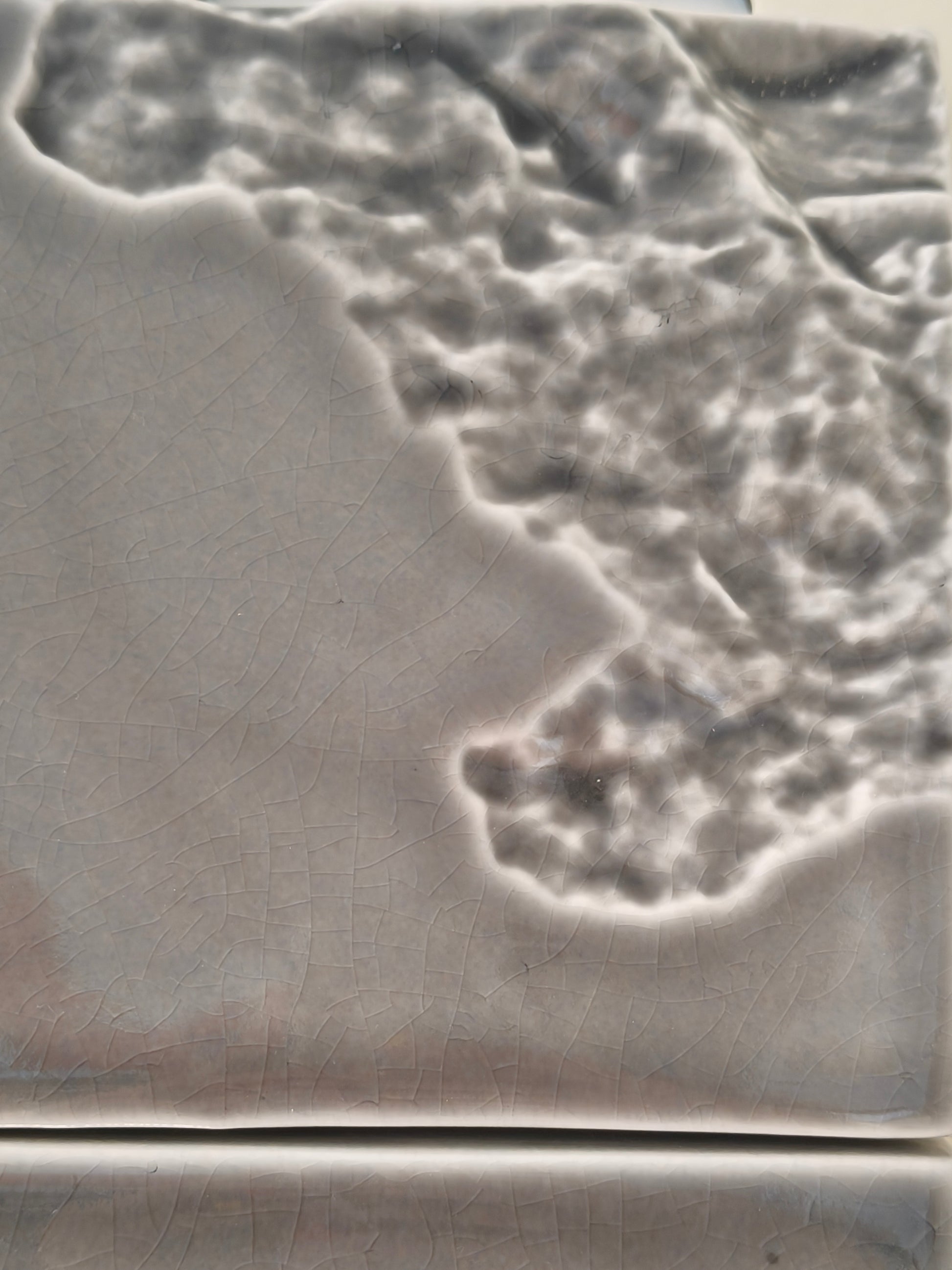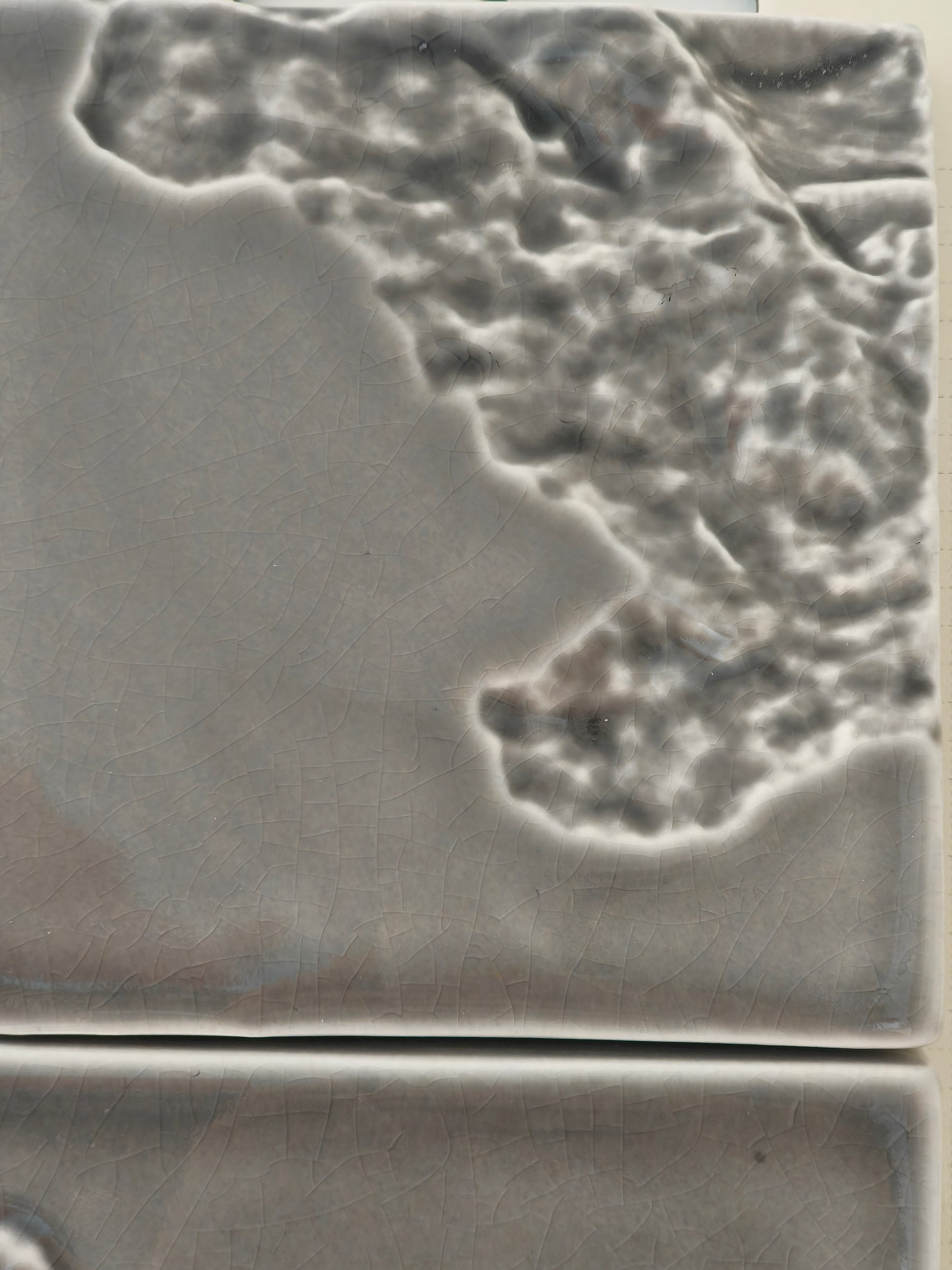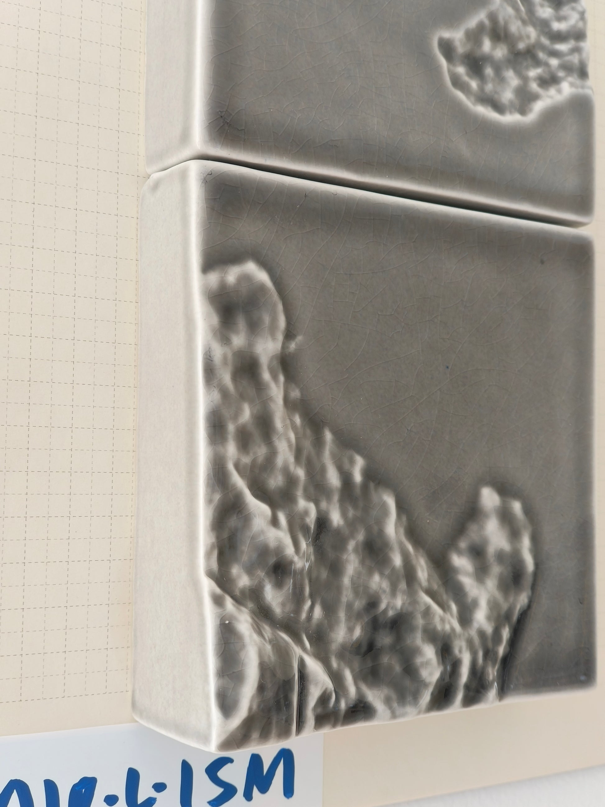 This series explores layered charcoal greys with subtle tonal gradients and fine crackle detailing beneath the glaze. Each tile reveals handcrafted variation in texture and shading—shifting between matte valleys and glossy elevated peaks—resulting in a richly atmospheric material expression that feels both raw and quietly refined.