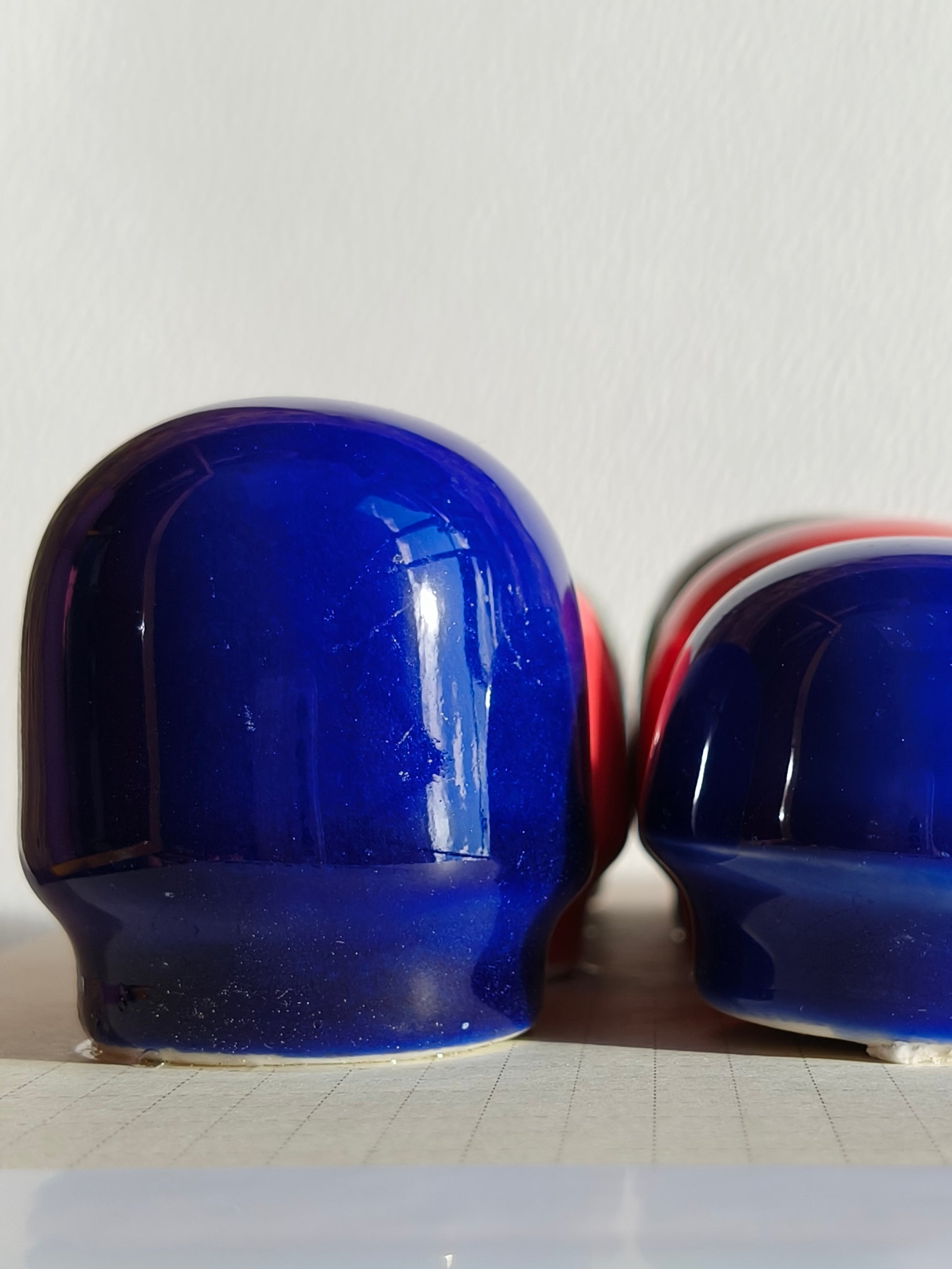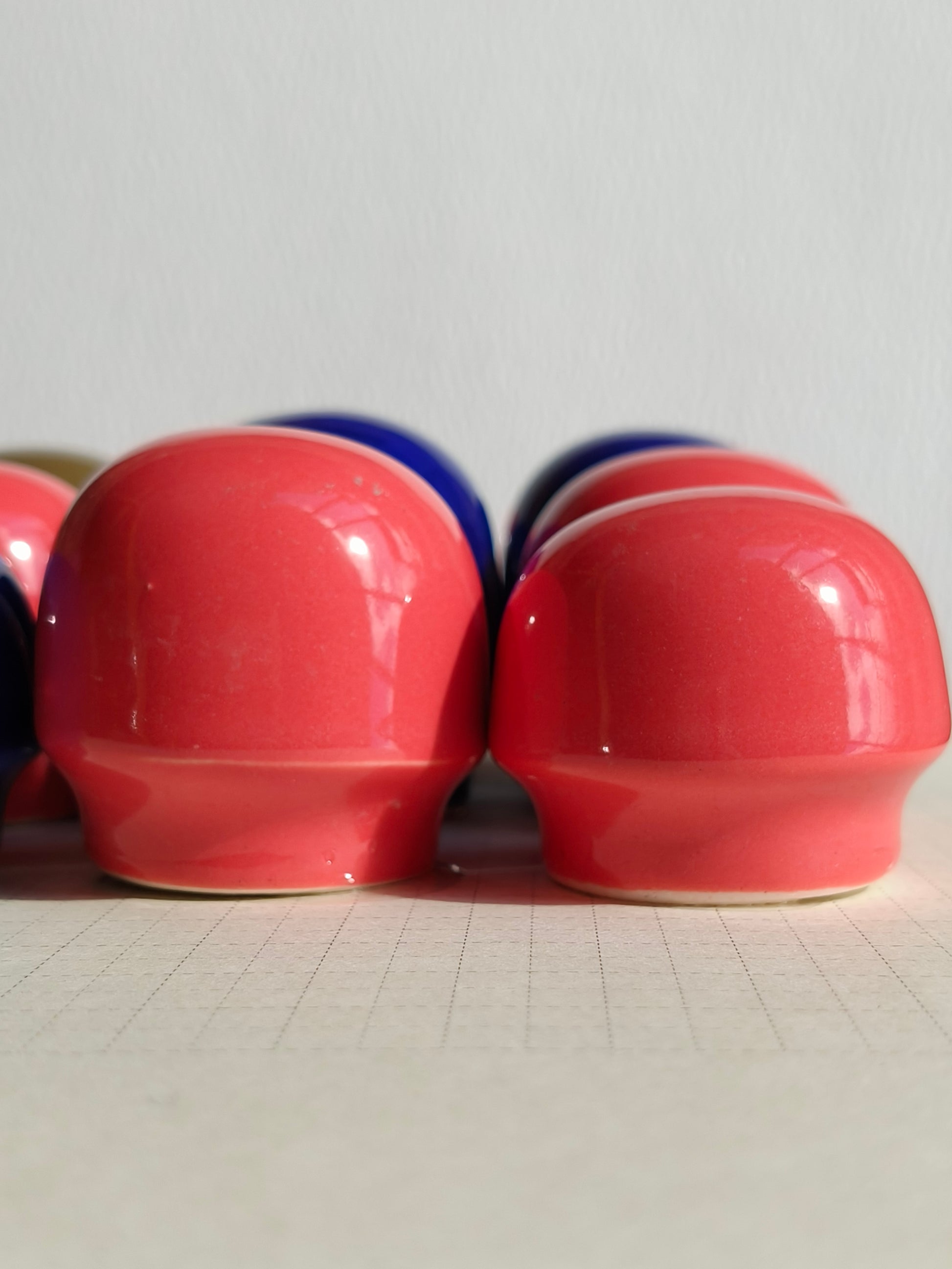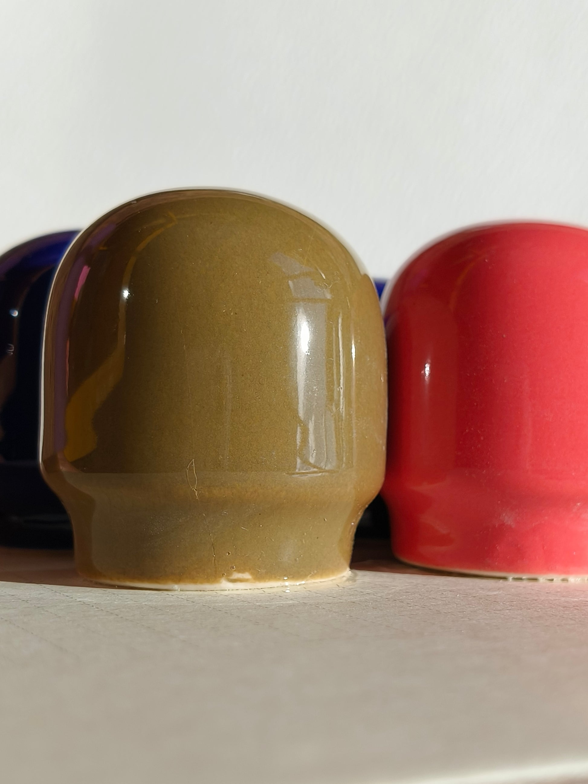 This series explores a cheerful palette of cobalt blue, clay pink, olive beige, and misty sage—each glaze revealing fine mineral texture and handcrafted tonal variation. The result is a contemporary, expressive atmosphere that feels both vibrant and softly comforting, with colour richness that enhances the tile’s bulbous geometry.