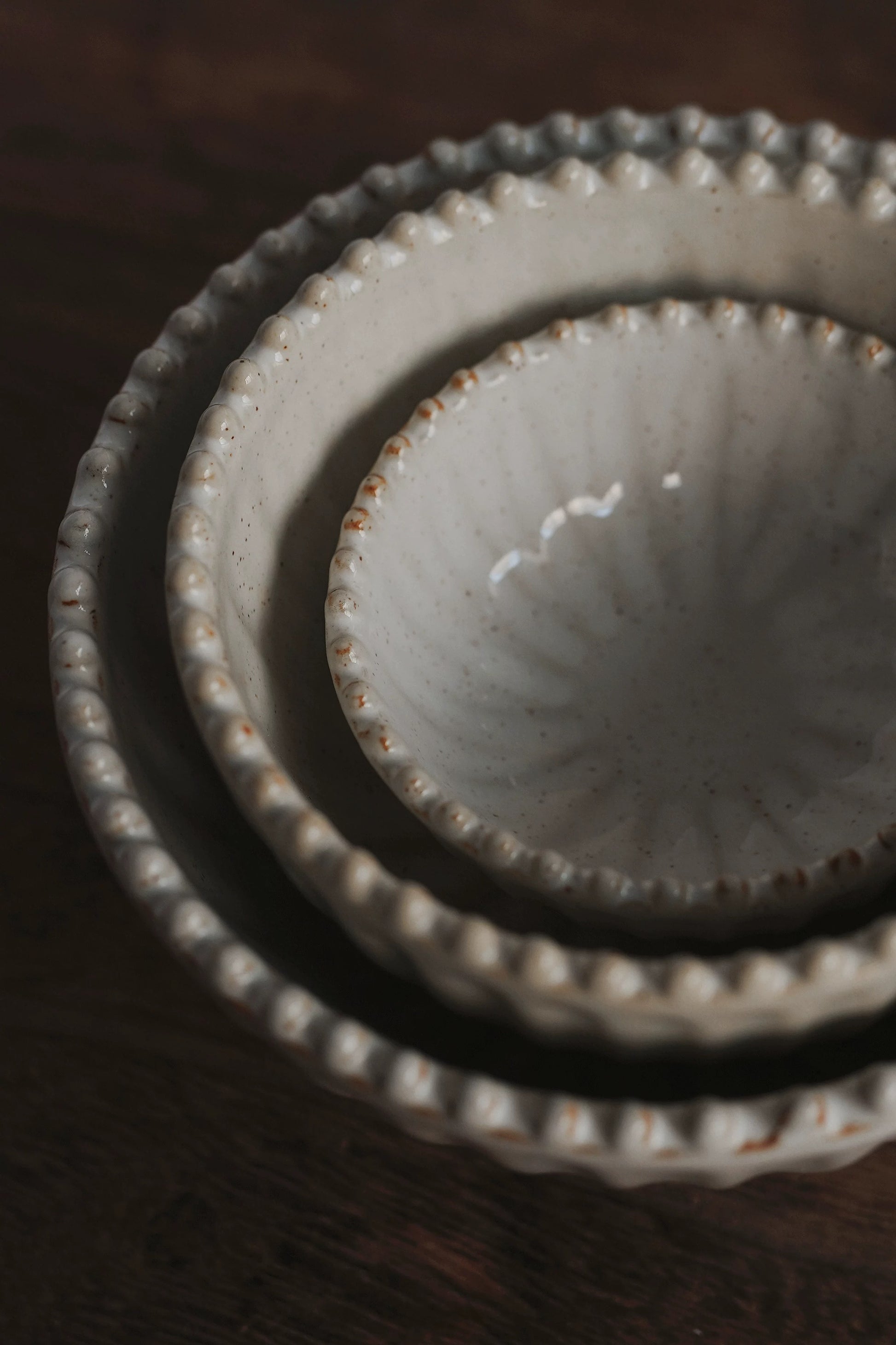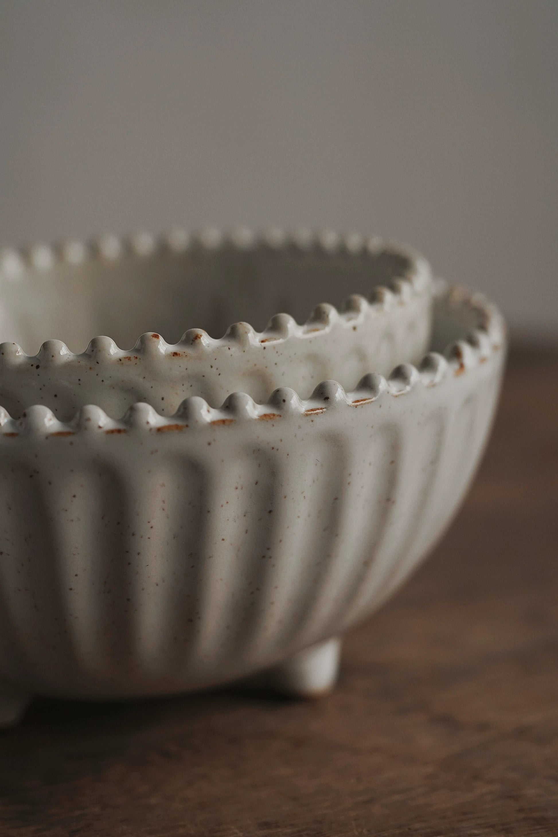 Discover understated elegance with the Ripplefoot Ceramic Nesting Bowl Set—a trio of handcrafted ceramic bowls designed to bring texture, balance, and warmth to your tableware collection. Each bowl features a beautifully ribbed surface and scalloped rim, complemented by a speckled glaze that evokes natural stone. The distinctive footed base adds artisanal character while offering visual lift and stability.